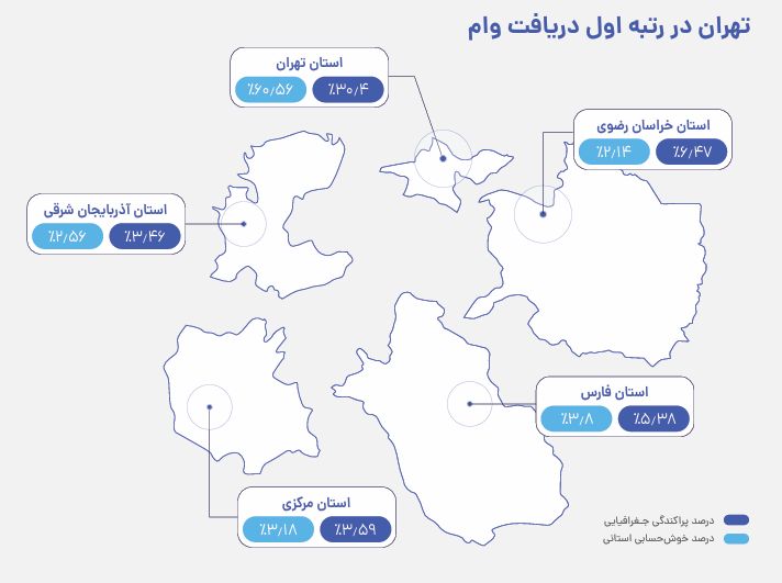 در سال ۱۴۰۳، تهران بهعنوان صدرنشین دریافت وام و خوشحسابترین استان معرفی شد. بر اساس دادهها، ۳۰/۴درصد از کل وامها به افراد تهرانی تعلق گرفته است. پس از تهران، استانهایی مثل خراسان رضوی (۶/۴۷درصد)، فارس (۵/۳۸ درصد)، مرکزی (۳/۵۹درصد) و آذربایجان شرقی (۳/۴۶ درصد) به ترتیب وام بیشتری دریافت کردهاند.