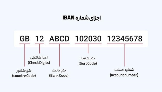 - کد کشور: دو حرف اول که کشور حساب را مشخص میکند (مثلاً IR برای ایران